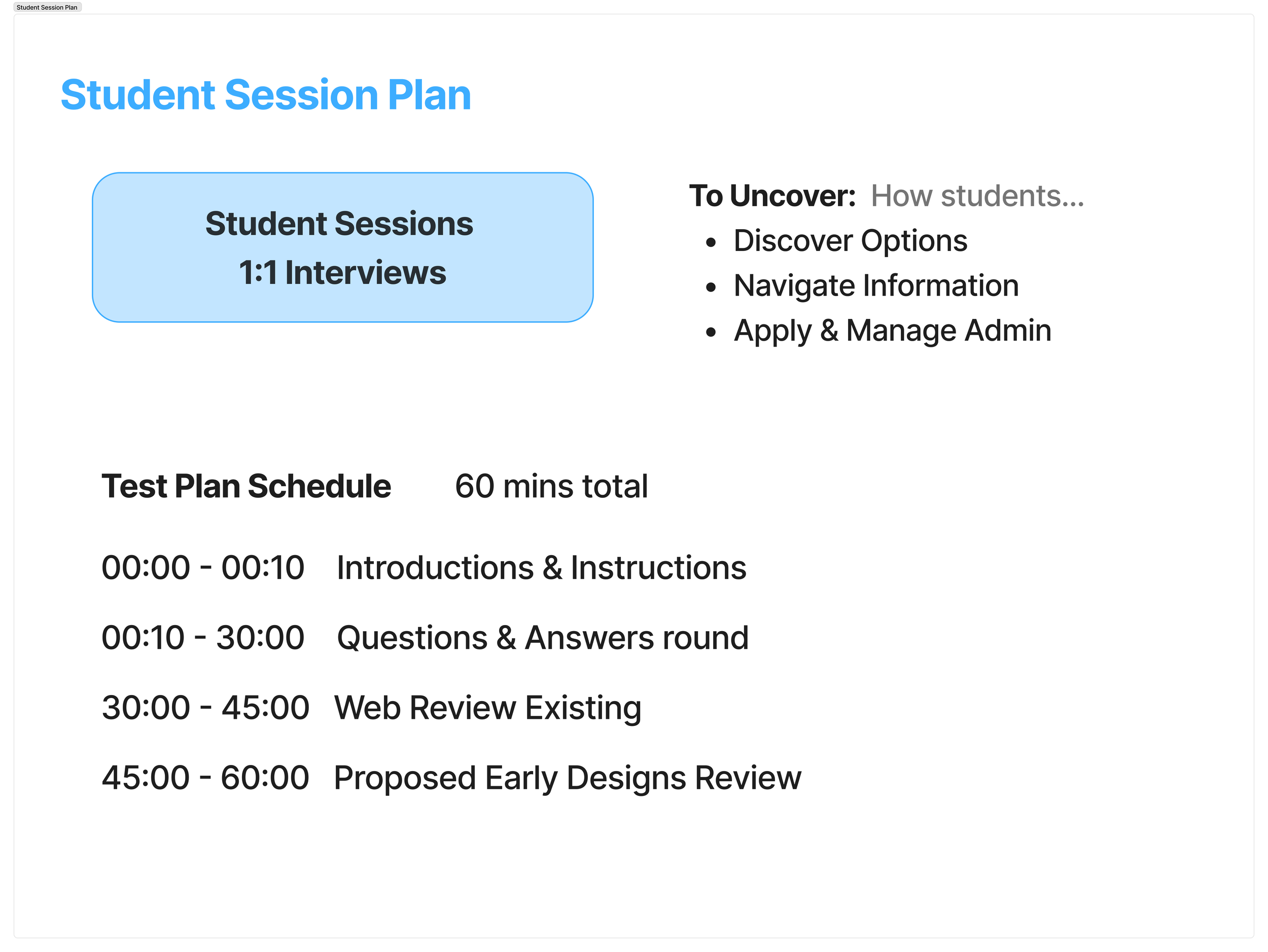 Next I created a list of questions to ask, reviewed with the team and finalised, which formed the base of the Interview Questions. The sessions ran for 1 hour, the first 30-40 mins for the conversational interview and the remaining time for the existing Web walk-through and Early Prototype review. Showing the prototype at the end to not add any bias to the web review.