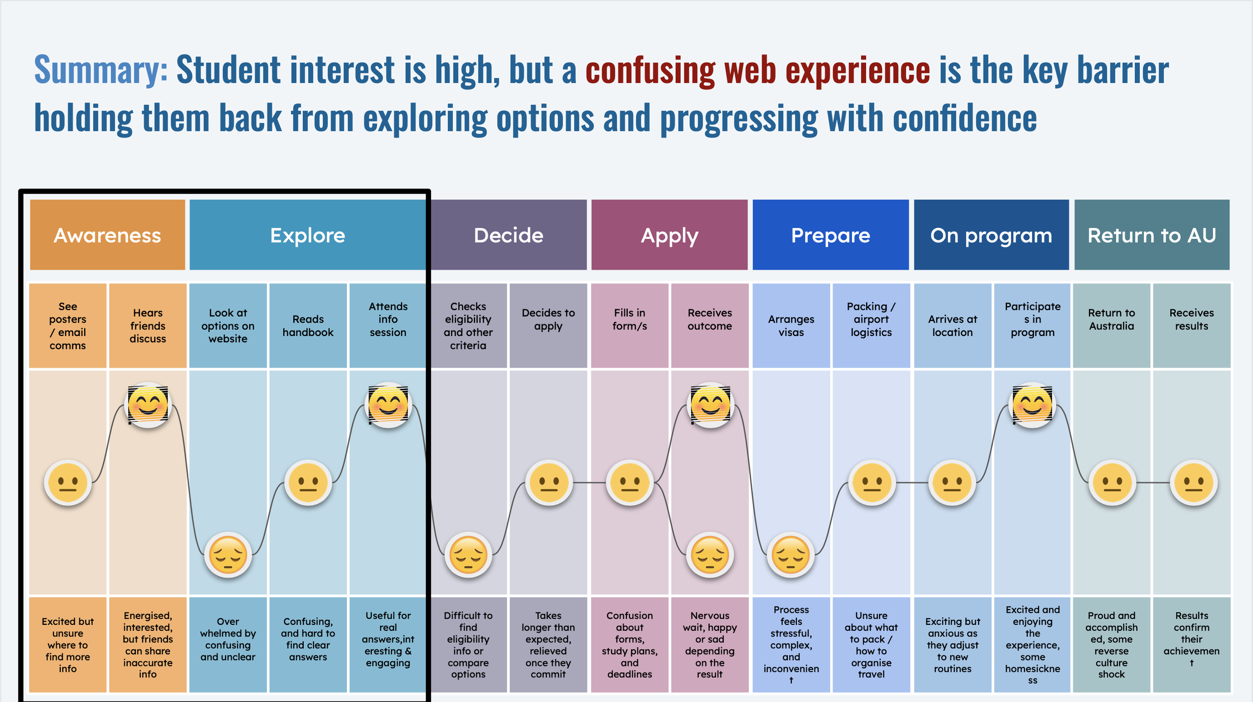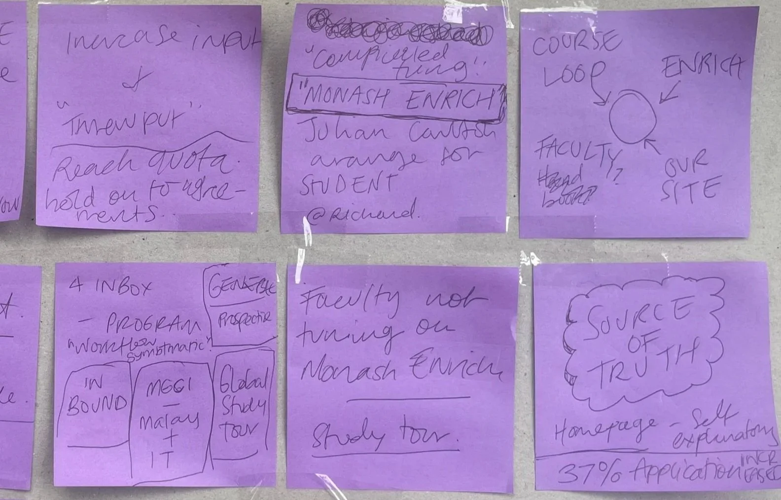 I began by walking through the current state journey from a Students Point of View, of all Digital Touch Points, covering discovery to application stages. Highlighting what can be improved (red post-its) and what’s working well (green post-its).